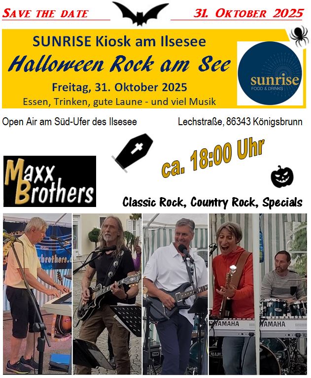 Für alle, die einen Ausflug an den Ilsesee in Königsbrunn am Vatertag auch gleich mit rockiger Musik verbinden wollen – dann merkt euch doch gleich mal diesen Termin – 29.5.2025 – ganz dick in eurem Kalender vor. Die Startzeit auf dem Plakat ist als „frühester Start“ zu verstehen. Kann sich noch geringfügig ändern.